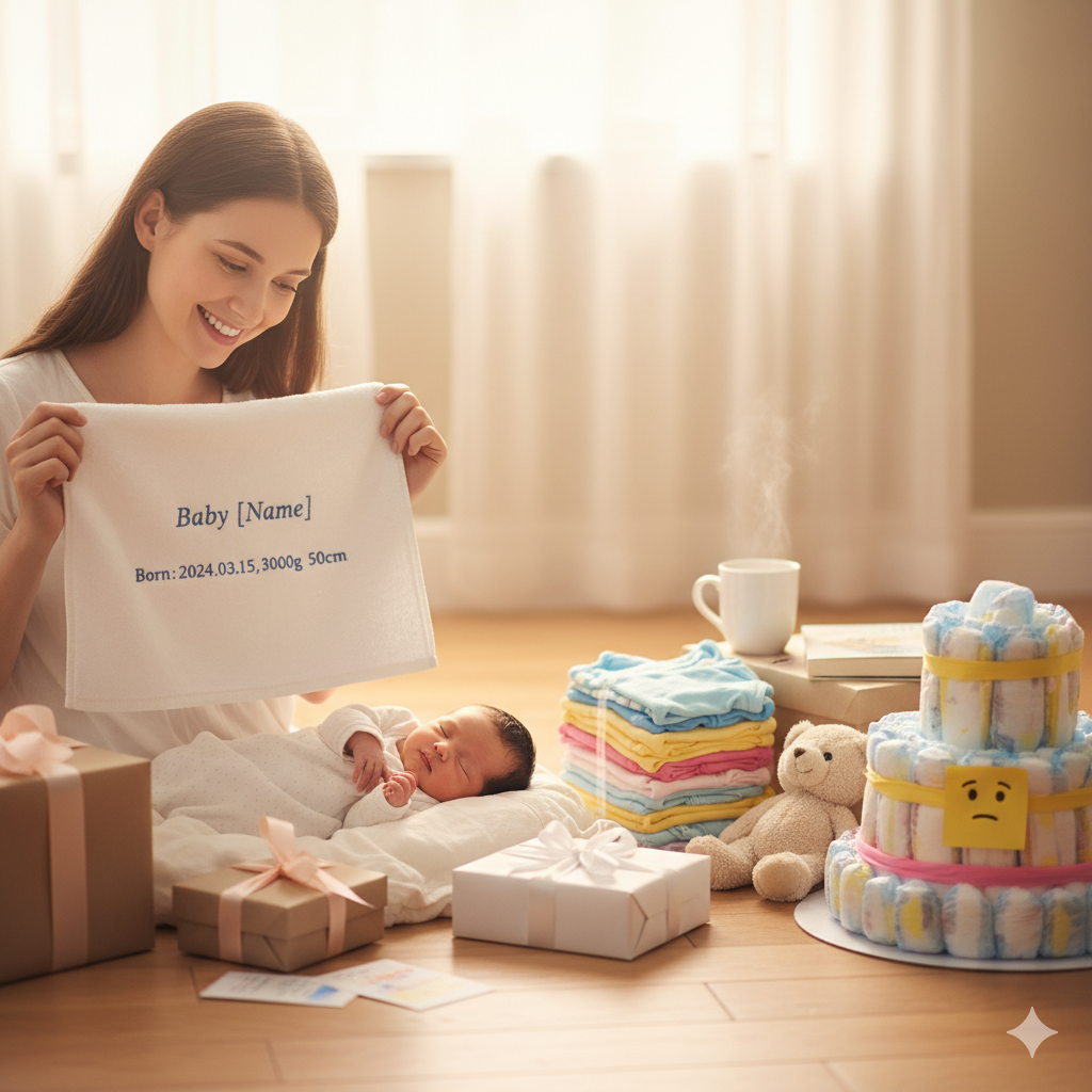 「バースタオル」は、高品質で実用的なバスタオルとしての役割と、誕生の感動を刻むメモリアルアイテムとしての役割を完璧に両立させた、まさに出産祝いの決定版です。